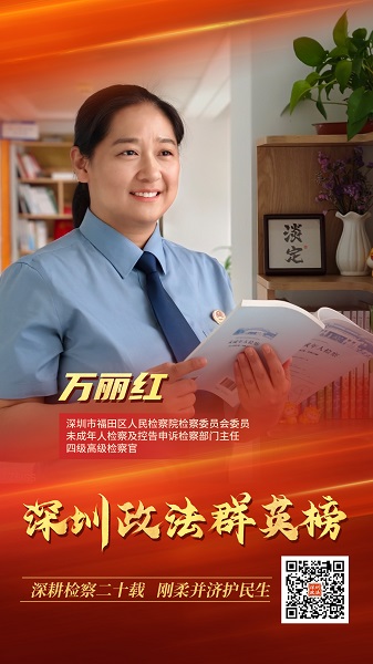 在深圳市福田区人民检察院,有这样一位女检察官。从刑事检察到民事行政检察,从公益诉讼检察到控告申诉检察,再到未成年人检察,她深耕检察一线21年,历经四大检察业务,凭借专业能力攻克无数难题。她就是福田区人民检察院检察委员会委员、未成年人检察及控告申诉检察主任、四级高级检察官万丽红。